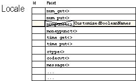 The base class of all facets, class locale::facet, does not have a facet identification. The class locale::facet performs the function of an abstract base class; there will never be any facet object of the base class type. However, all concrete facet classes have to define a facet identification. In the example above, we inherited the facet identification from the base class we derived from, that is, the standard facet class numpunct. Every object of our facet class CustomizedBooleanNames has a facet identification that identifies it as a numpunct facet. As the facet identification serves as an index to the locale object's set of facets, our facet object replaced the current numpunct facet object in the locale object's set of facet objects.