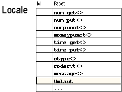 A locale object maintains a set of facet objects. Each facet object has an identification that serves as an index to the set of facet objects. This identification, called id, is a static data member of the respective facet class. Whether or not a facet object will replace another facet, or be an actual addition to the locale object's set of facet objects, solely depends on the facet's identification.