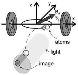 Figure 1: Schematic of the trap geometry (shown here are the quadrupole coils for the static field, the TOP coils producing B0 are omitted for clarity) and of the shadow-imaging method. Imaging along the y-axis allowed us to measure the velocity of the atoms along the x and z axes.