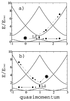 Band structure of a BEC in an optical lattice (V0 = 2 Erec) and LZ tunneling [ground to excited state (a) and excited to ground state (b)]. When the BEC is accelerated across the edge of the Brillouin zone (BZ) at quasimomentum 1, LZ tunneling can occur. Further acceleration will result in the condensate part in the upper level undergoing LZ tunneling to higher bands with a large probability (due to the smaller gaps between higher bands), leaving them essentially unaffected by the lattice. After the first crossing of the edge of the BZ, increasing the lattice depth and decreasing the acceleration leads to a much reduced tunneling rate from the ground-state band at successive BZ-edge crossings.