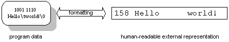 Formatting is the transformation from a byte sequence representing internal data into a human-readable character sequence; for example, from a floating point number, or an integer value held in a variable, into a sequence of digits. Figure 2 below illustrates the formatting process: