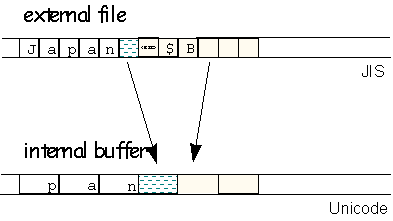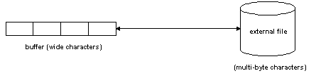 Code conversion is the process of translating one character representation into another; for example, from wide characters held internally to a sequence of multibyte characters for external use. Wide characters are all the same size, and thus are convenient for internal data processing. Multibyte characters have different sizes and are stored more compactly. They are typically used for data transfer, or for storage on external devices such as files. Figure 3 below illustrates the conversion process: