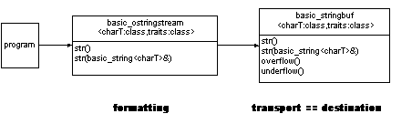 There are functions for getting and setting the string to be used as a buffer. Internally a specialized stream buffer is used. In this particular case, the buffer and the external device are the same. Figure 9 below illustrates how the string stream classes work: