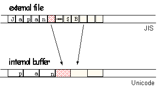 Since wide characters are usually used for internal representation of characters in a progam, and multibyte encodings are used for external representation, converting multibytes to wide characters is a common task during input/output operations. Input to and output from files is a typical example. The file will usually contain multibyte characters. When you read such a file, you convert these multibyte characters into wide characters that you store in an internal wide character buffer for further processing. When you write to a multibyte file, you have to convert the wide characters held internally into multibytes for storage on a external file. Figure 3 demonstrates graphically how this conversion during file input is done: